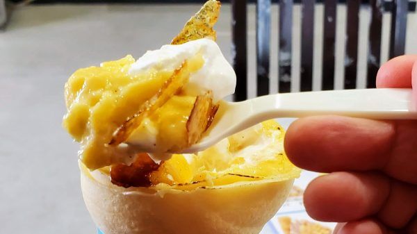 ついに出来立てクレープブリュレがやってきました!クレープのお顔はバーナーでキャラメリゼされていてツヤツヤ、スプーンで触れるとパリパリです。そのパリパリのカラメルを割って中のクリームをスプーンですくってみると、その下には濃厚なカスタードクリームと生クリームが。カラメル味と2種のクリームの三重奏を楽しむことができます。