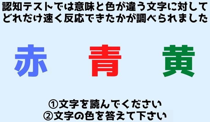 認知テストでは「緑色で塗られた「黄」の文字」や「青色で塗られた「赤」の文字」など、塗られた色と実際の意味が異なるものが使用され、被験者たちは塗られた色あるいは文字の意味を素早く答えるように求められました。