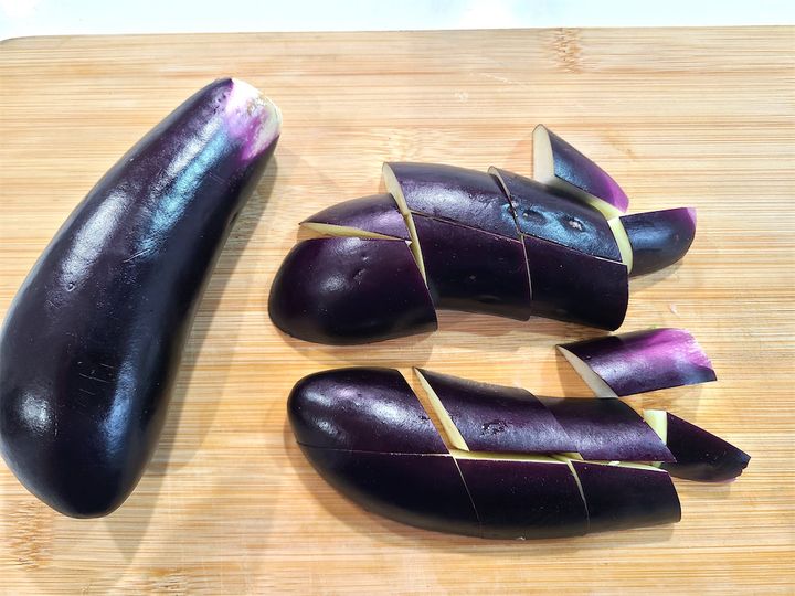 3. なすのヘタを落とし縦に4等分し、一口サイズにカットします。