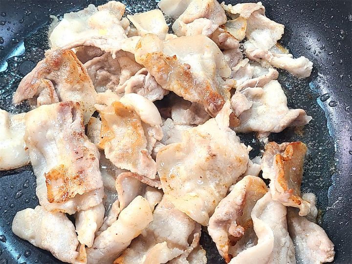 4. 豚肉は4cm幅くらいに切り、塩、こしょうし、フッ素樹脂加工のフライパンに油を引かず中火で焼きます。肉から油が出て、表面がカリッとするくらいまでしっかり焼くとおいしく仕上がります♪