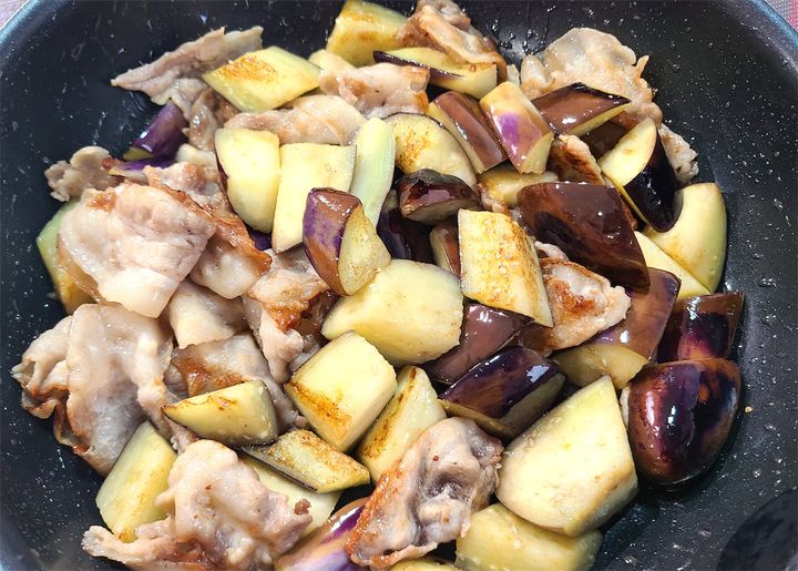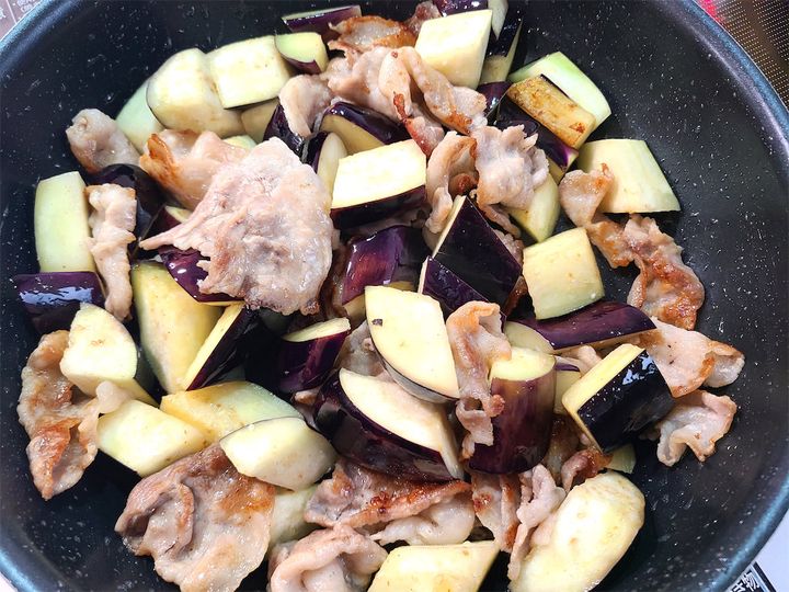 6. なすにも焼き目がつき、なすの表面に照りが出るまで炒めましょう。