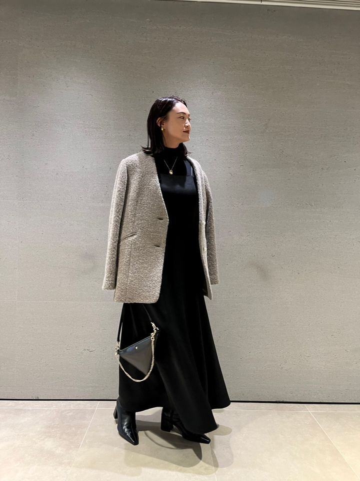 「アルパカの毛をループ織で製作された表情豊かな素材のジャケットがポイントです。ベーシックに見えるコーディネートですが、実は、このジャケットはイタリアはジオリカ社で作られたものです。製作ストーリーに、気持ちが高まるアイテムを着用しました。合わせるアイテムは黒でまとめ、シックにジャケットを引き立てるよう仕上げました」