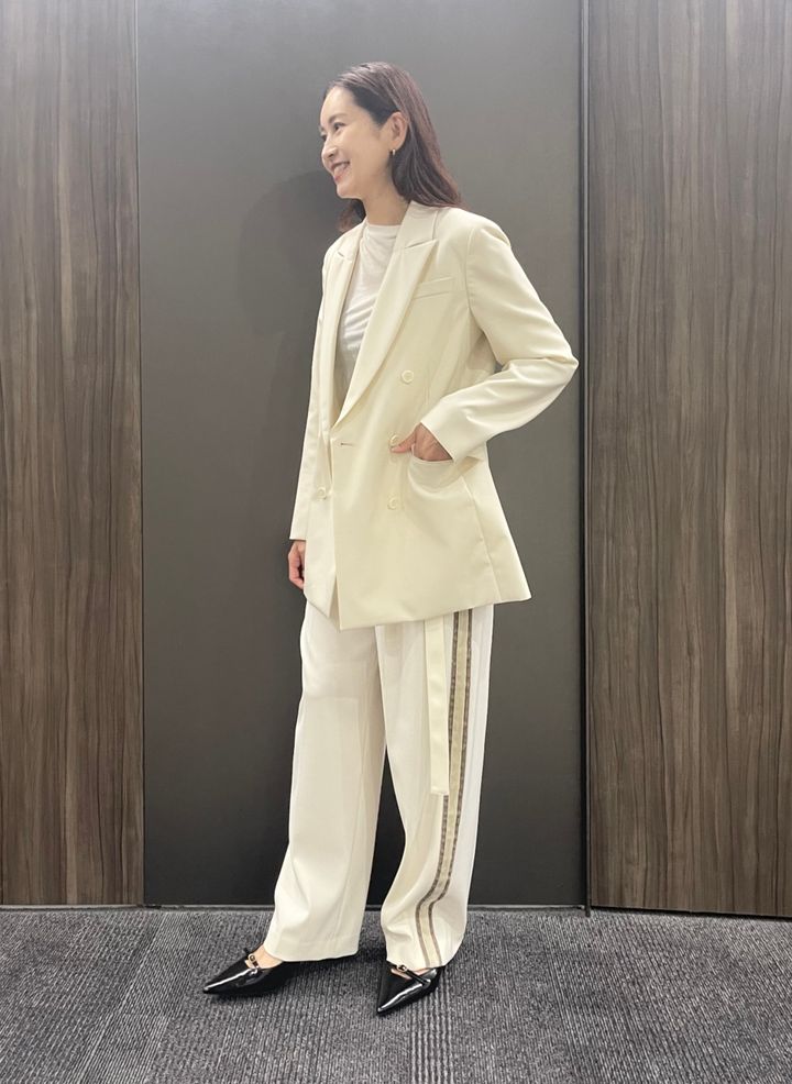 「オールホワイトのジャケットスタイルをトラックパンツ風のスラックスでラフにコーディネートしました。ハンサムなスタイリングなので足元はエナメルパンプスでレディライクに」
