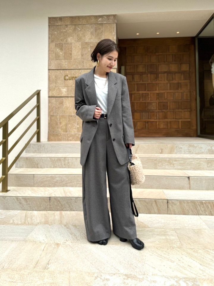「着用したウールのテーラードジャケットはIラインシルエットがハンサムな印象で気に入っています。シンプルな白のインナー合わせてヌケ感を意識しました。大ぶりなアクセで女性らしさをプラスしつつ、ロリステッラのモコモコ素材にレザーのハンドルが効いたミニバッグを合わせて自分らしく仕上げました」