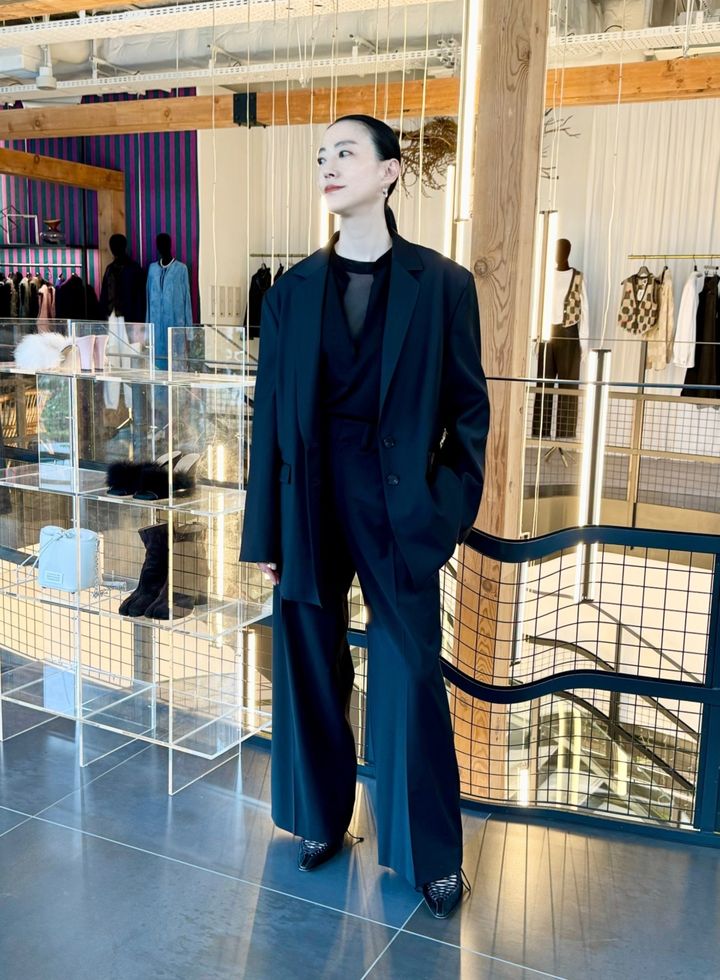 「オーバーサイズのテーラードジャケットに同素材のサスペンダー付きパンツを合わせたセットアップのコーディネートです。オールブラックのワンカラーコーデにしたので、チュール素材のカットソーやガラス素材のクリアなピアス、レースアップの部分から肌見せができるシューズでヌケ感を出しました」