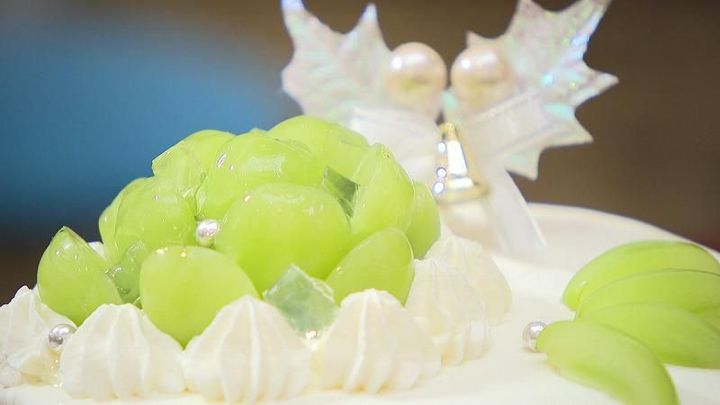 北海道産のシャインマスカットがキラキラ輝くケーキ。
