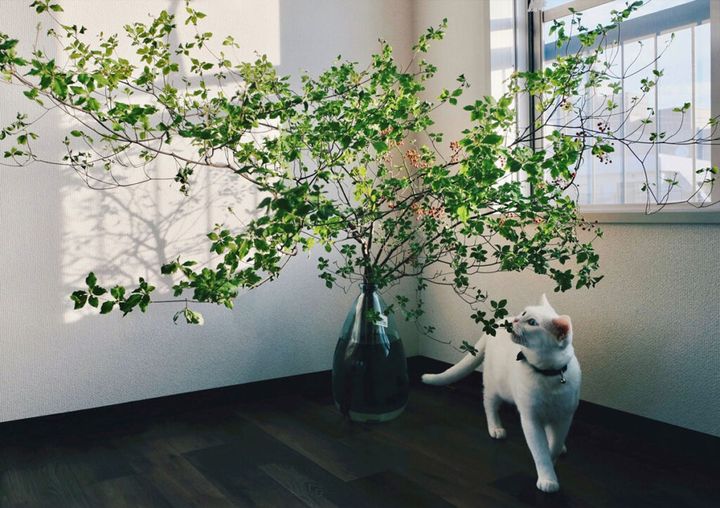 たくさんの葉っぱが付いた、大きな枝。クンクン。