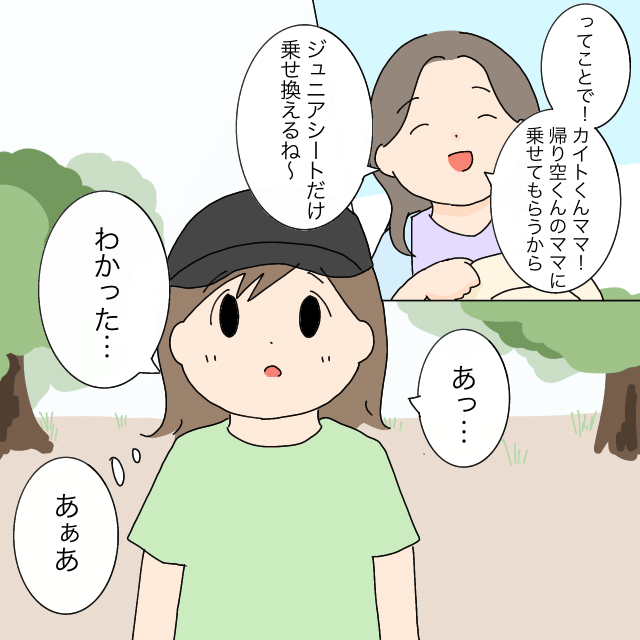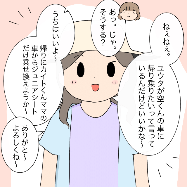 「ってことで!カイトくんママ!帰り空くんママに乗せてもらうから。ジュニアシートだけ乗せ換えるね~」ユウタくんママにそう告げられたいくこさんは、「あっ・・わかった・・」驚いてそう答えました。