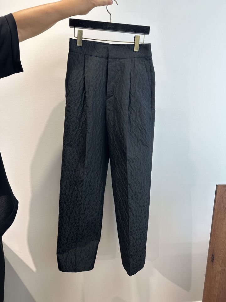 ディレクター櫛部氏のこだわりがつまった華やかなジャガードパンツは、シルエットも立体的で美しくお腹周りもカバーしてくれるので普段パンツを履かない方にもおすすめ。タイトなトップスやシンプルなセーターをあわせるだけでモード感が演出できます。同じ生地のトップスもあるので、華やかに着こなしたい場合は上下合わせるのもオススメ。ブラックとアイボリーの2色展開。