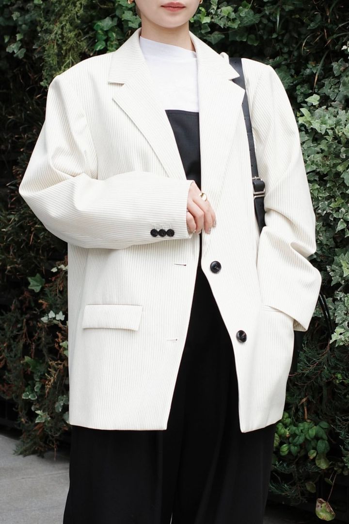 「メインには、ハリのある白のストライプジャケットを。そこにパンツやブーツ、バッグをブラックに合わせることで、モノトーンなモード感を意識しました。髪の色を引き立たせるよう、ミニマルな色使いでコーディネートにしました」