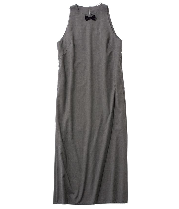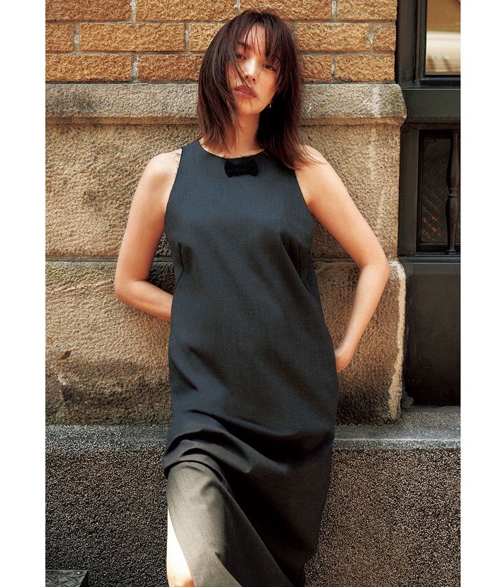 マニッシュなウールツイルで端正に。ベロアのプチリボンは取り外し可。バックスタイルにさりげなくつけても大人。ワンピース¥38,500(サードマガジン×ミコモリ/サードマガジン)ピアス¥15,400(カラ・ユ/ショールーム ロイト)