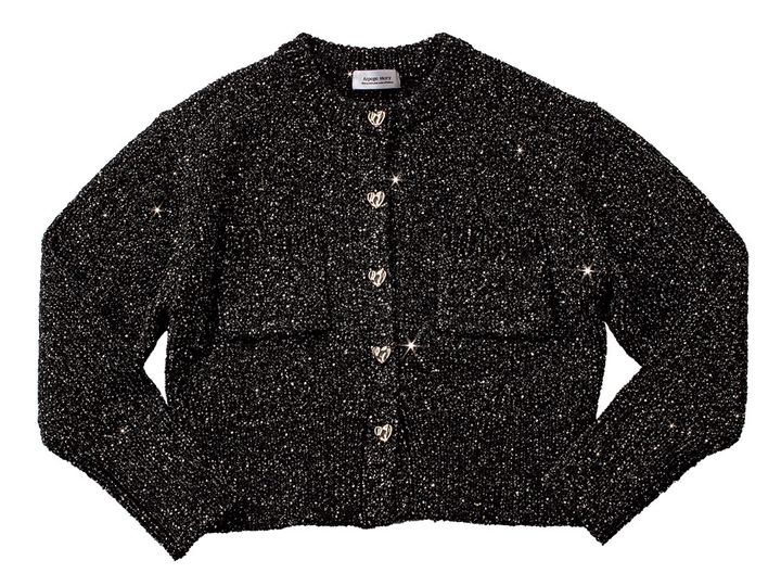 甘ゴコロを満たすキラキラカーデと辛口のハートボタン。カーディガン¥23,100(アルページュストーリー)