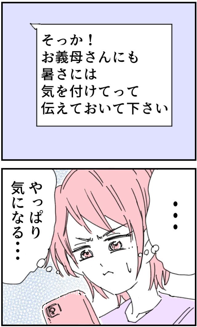 「そっか!お義母さんにも暑さには気を付けてって伝えておいて下さい」と、返信が遅かったことの説明は何もないいちろうさんのメッセージに「やっぱり気になる・・・」とモヤモヤが晴れないかおりさん。