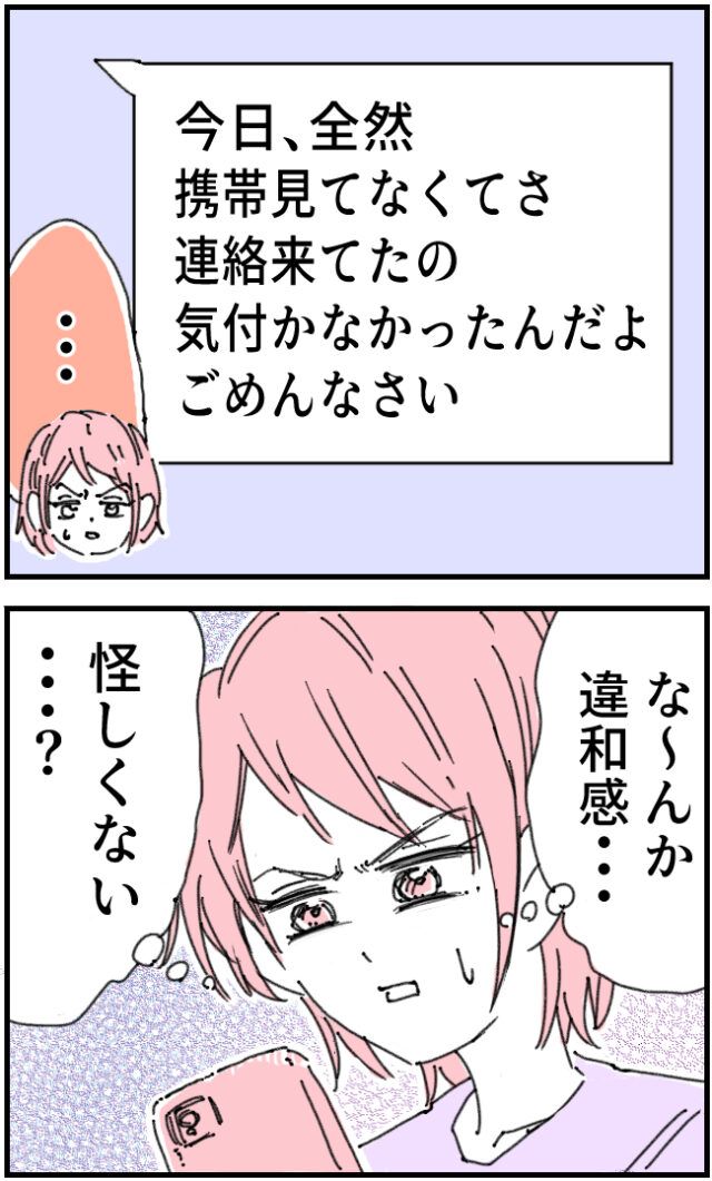 すると「今日、全然携帯見てなくてさ。連絡来てたの気付かなかったんだよ。ごめんなさい」といちろうさん。そのメッセージを見て「な~んか違和感・・・。怪しくない・・・?」妻のかおりさんは何となく腑に落ちません。