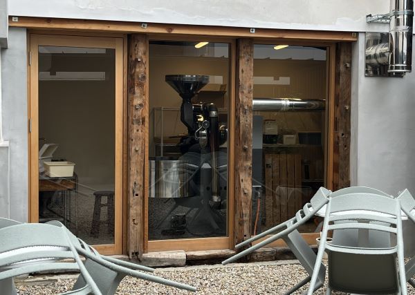 途中にある中庭には、コーヒーの焙煎室がありました。伺った日は雨模様だったのでお席は利用できなかったのですが、普段は焙煎の様子を眺めながらお食事などできるそうですよ。