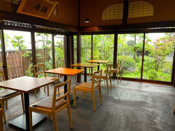 奥の部屋に入ると、四季を感じられるお庭が現れます。お座敷だったこちらは、椅子席に変わっていました。先にいらっしゃったお客様も、お庭側でお食事を楽しまれていましたよ。