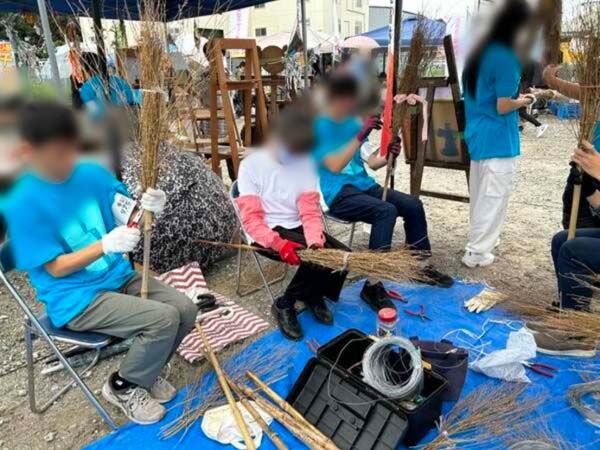 伝統の亀崎ほうきを作る千葉敬愛高校の生徒さん達。1,000円で販売。