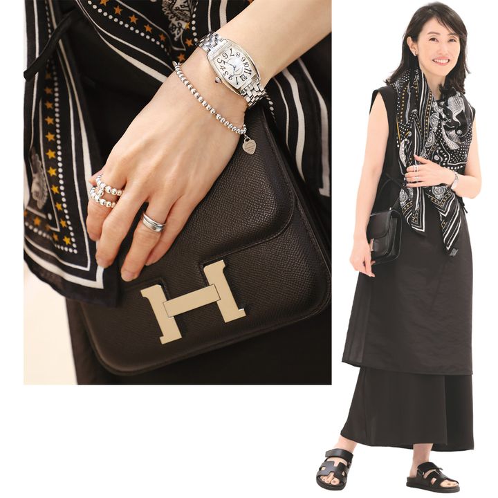 黒コーデにペイズリー柄の大判ストールを巻いてポイントに。時計はフランクミュラー、バッグ、サンダル、ジュエリーはエルメスで揃えました。ルージュエルメスサティネ80で上品に。