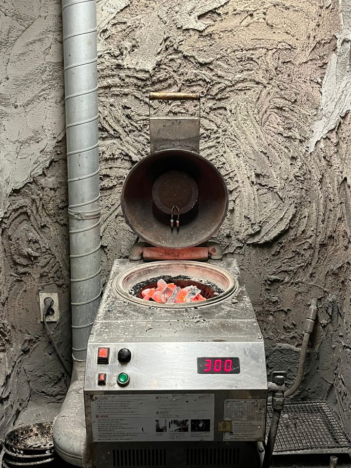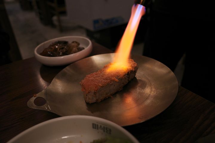 明太子に漬けられた明太子サムギョプサルは表面を炙ってから、炭火で焼きます!