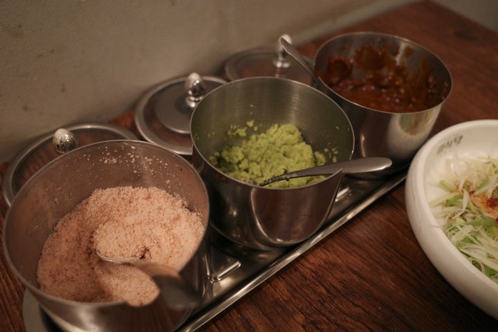 焼き上がったサムギョプサルは、卓上の調味料やパンチャン(副菜)と一緒にサンチュに巻いていただきます!
