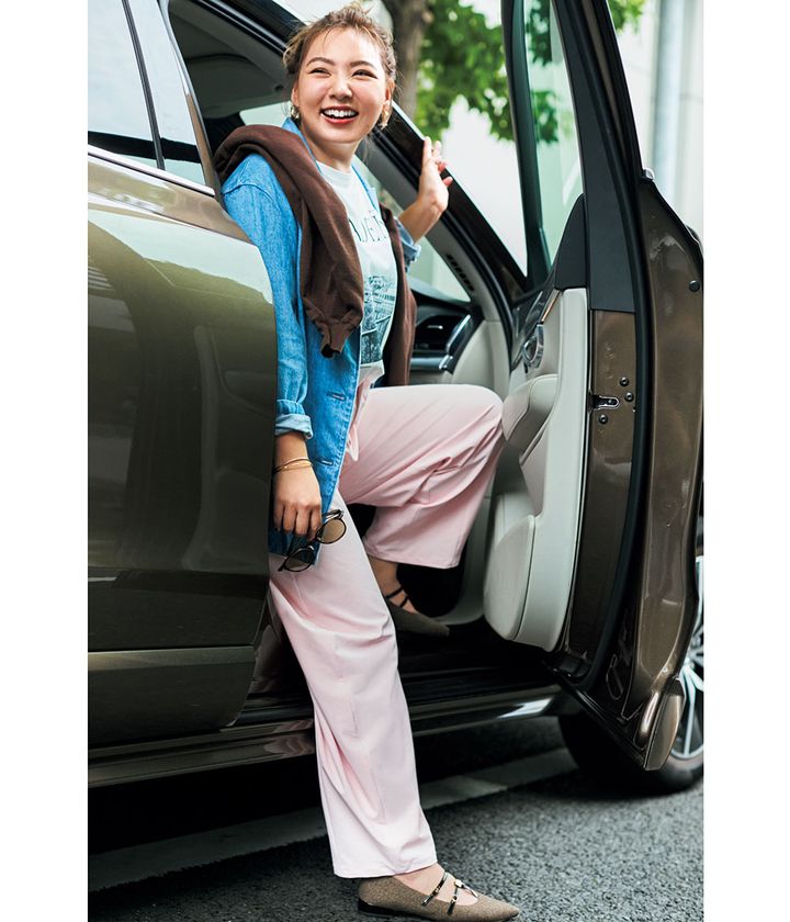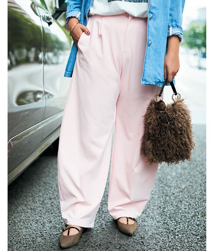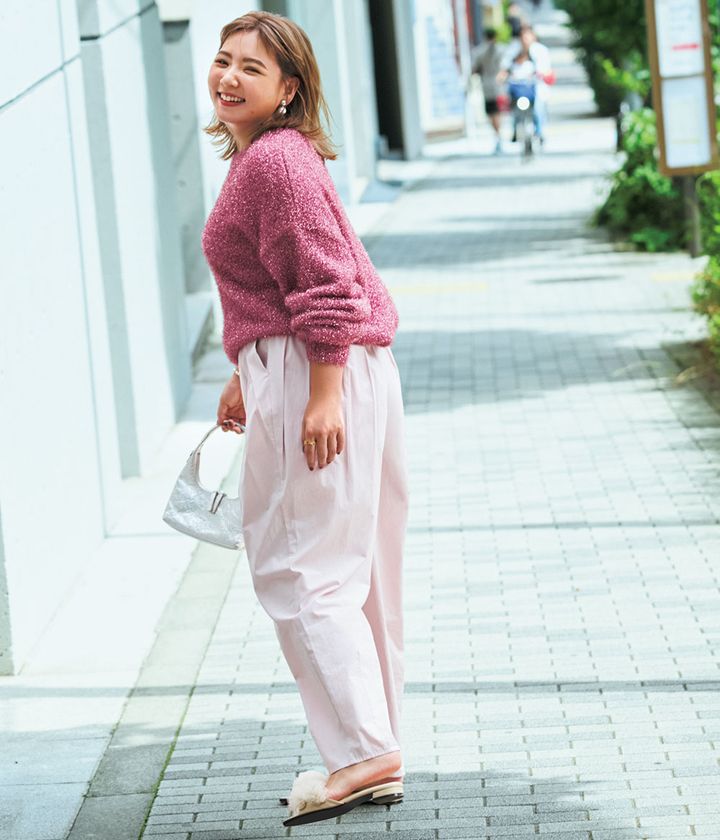 甘さが引き立つピンクで日常コーデを格上げ! マシュマロ代表、タレント・野呂佳代さんが「ピンクカーヴィパンツ」を着こなしました。