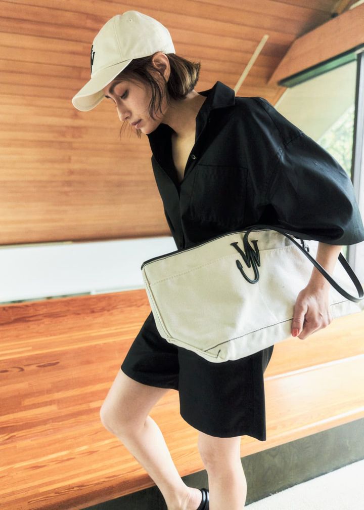 半袖シャツ¥29,700(サードマガジン)、ショートパンツ¥25,300(サードマガジン)、キャップ¥36,300、バッグ¥94,600(共にJWアンダーソン/JW ANDERSON 渋谷店)、シューズ¥59,400(パロマバルセロ/ハウス オブ ロータス)