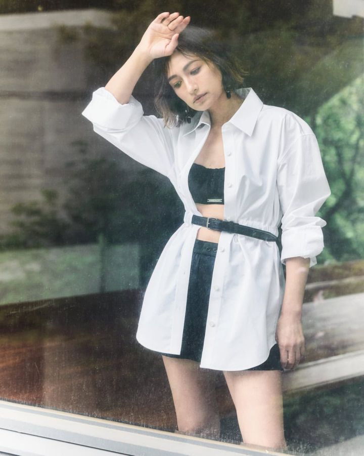 ベルト付きシャツ¥107,800(アレキサンダーワン)、ショートパンツ¥77,000(アレキサンダーワン)、ブラ¥16,500(プランクプロジェクト/プランクプロジェクト 青山店)、ピアス¥143,000(ソフィー ブハイ/エスケーパーズ アナザーワールド)