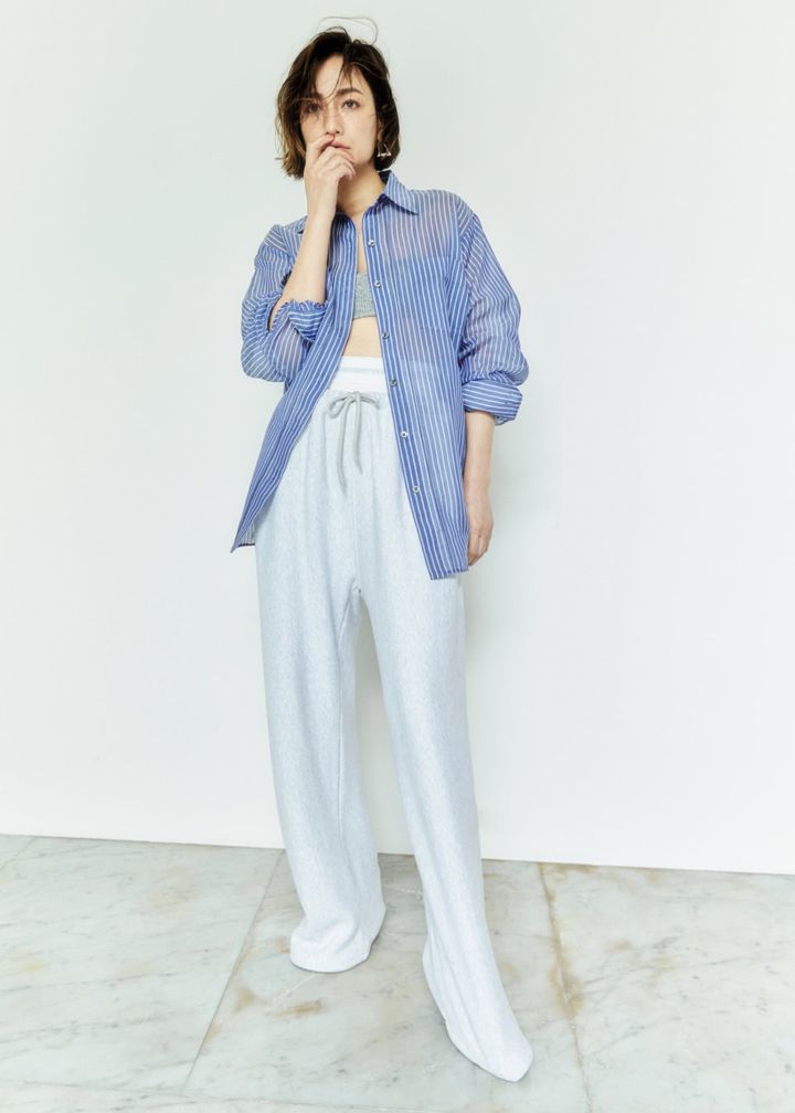 ストライプシャツ¥42,900(アパルトモン/アパルトモン 青山店)、ニットブラ¥24,200(オーラリー)、スエットパンツ¥80,300(アレキサンダーワン.ティー/アレキサンダーワン)、ピアス¥33,000(バー ジュエリー/エルディスト)、サンダル¥108,900(フランチェスコ ルッソ/ロンハーマン)