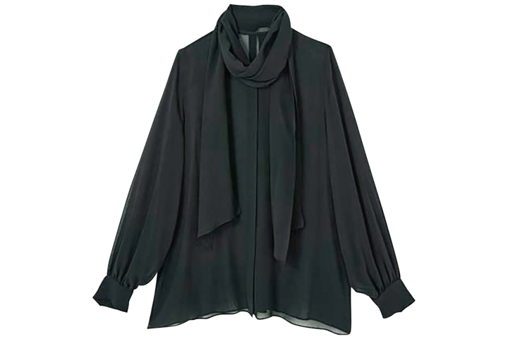 「年齢が出がちな肩まわりや二の腕を上手にカバーしてくれ、ウエストリボンで着丈も調節可能、上品なチョコレートブラウンと、どこを取っても最高なブラウス。まさに万能。こういうブラウスを1枚持っておくと心強いはず」(加藤さん)