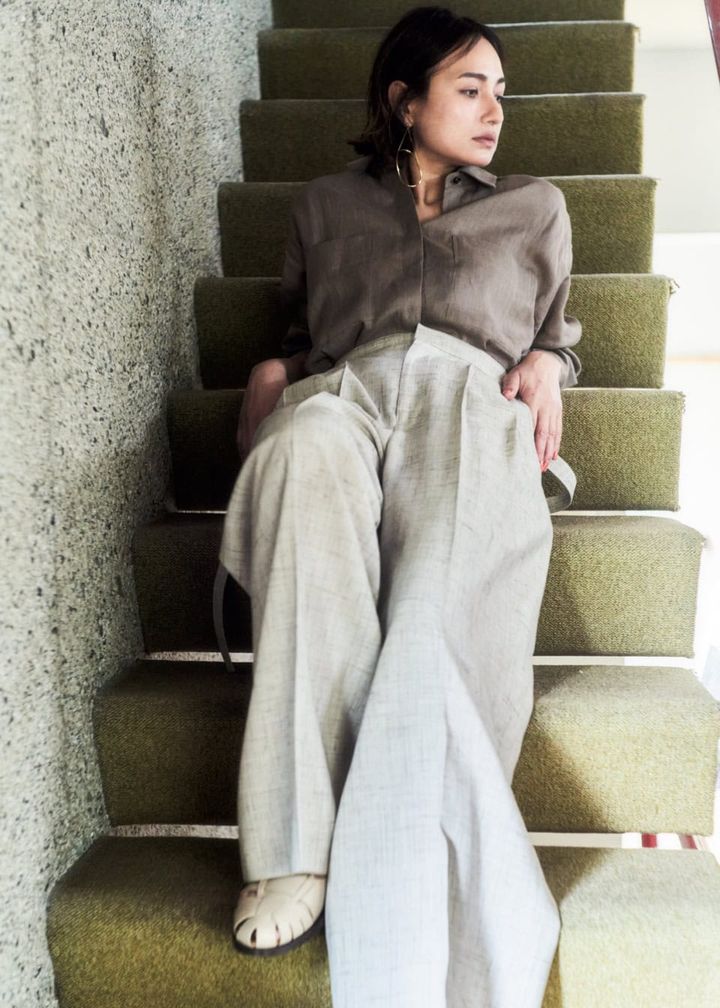 リネンシャツ¥62,700(カオス/カオス新宿)、パンツ¥59,400(トゥモローランド ビー/トゥモローランド 渋谷本店)、ピアス¥45,100(バー ジュエリー/エルディスト)、サンダル¥81,400(ヘリュー/ショールーム セッション)