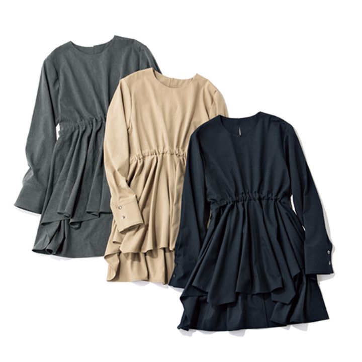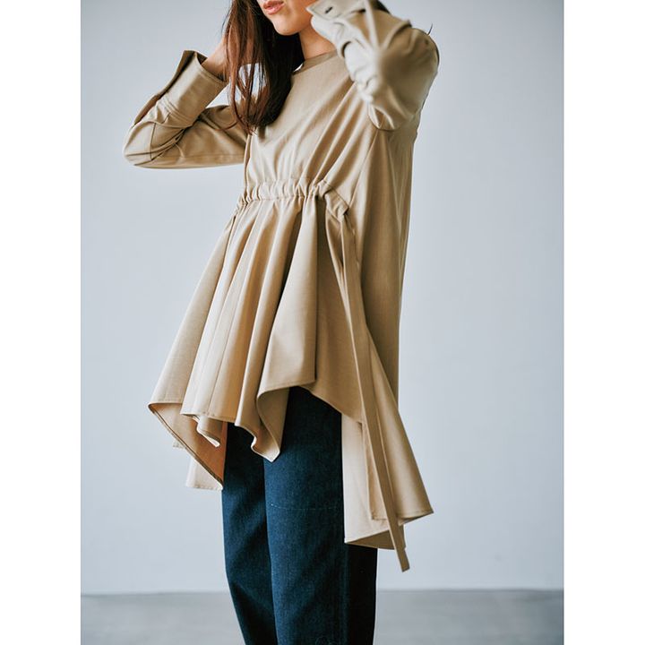 しっかりとした生地感&軽やかな着心地でオールシーズン着用可能。胸下すぐのウエストマークやアシンメトリーな裾はスタイルアップ効果にも一役。