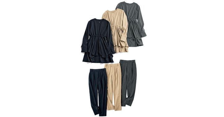 厳しい暑さもようやく収まり、待ちに待った秋服を楽しめる時季になりました。そこで今回は、1点投入で秋らしく&今っぽく仕上がるトレンド服を豊富にラインナップ!今回は、体形カバーもできて1枚でも決まるロングブラウスと、秋冬トップスとの相性抜群のキレイめパンツのセットアップをご紹介。絶妙なベーシックカラーはどの色も持っていて損なし!