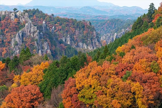 「耶馬渓(やばけい)」は、 2017年4月には「やばけい遊覧~大地に描いた山水絵巻の道をゆく~」として日本遺産に登録された景勝地です。岩山や渓谷が美しい自然景観をつくり出しています。切り立った奇岩や奇峰が連なるが特徴的で、全長約36kmのサイクリングコース「メイプル耶馬サイクリングロード」があり、気軽に紅葉狩りができます。例年10月下旬~11月中旬が見頃です。