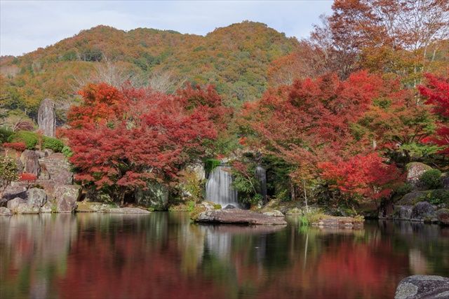 耶馬溪ダム完成を記念してつくられた、耶馬渓ダム記念公園の「溪石園(けいせきえん)」もぜひ訪れたいスポット。大小12万個の耶馬溪の石を使用しており、中には高さ6mの巨石もあります。毎年秋は、庭園内をライトアップ。光と影が紅葉した木々を幻想的に映し出します。