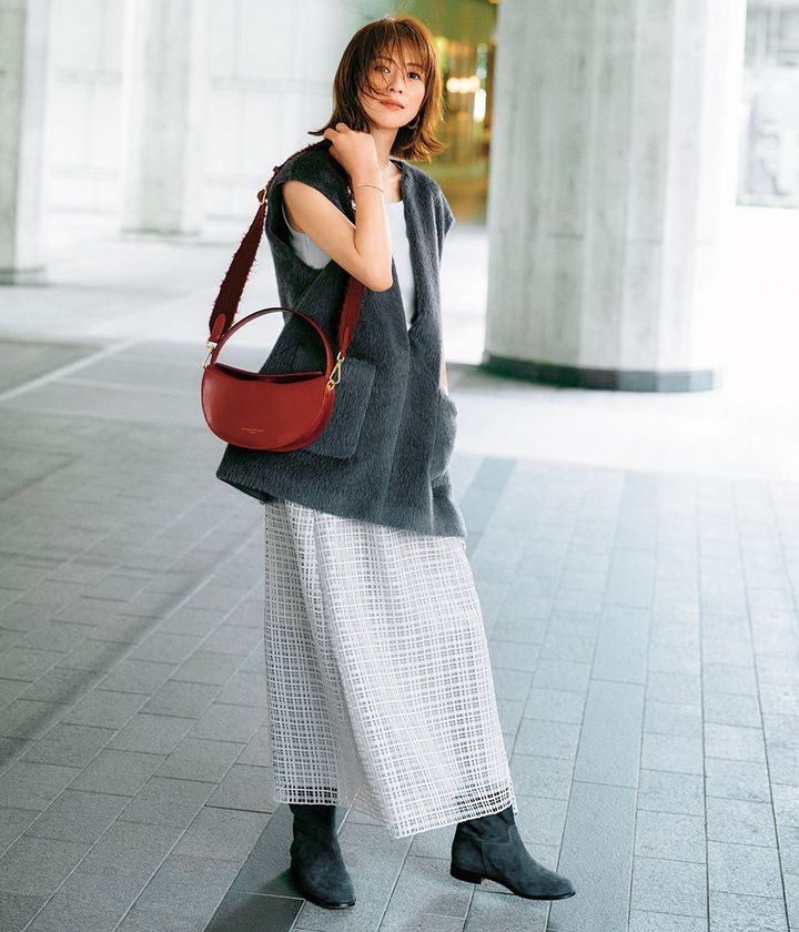 ジレ¥132,000タンクトップ¥12,100スカート¥61,600(すべてebure/LITTLE LEAGUE INC.)バッグ¥64,900(ジャンニ キアリーニ/ジャンニ キアリーニ 銀座店)ブーツ¥121,000(ネブローニ)ピアス¥20,900(ローラ ロンバルディ/八木通商)ブレスレット¥33,000(シンパシー オブ ソウル スタイル/フラッパーズ)