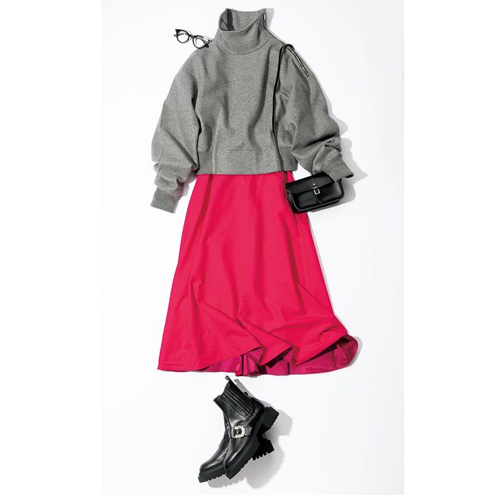 プルオーバー¥49,500(システム/アマン)スカート¥36,300(ロンハーマン)バッグ¥19,800(ケンブリッジ サッチェル/エスピービー)ブーツ¥27,500(ダイアナ/ダイアナ 銀座本店)メガネ¥42,900(アイヴァン/アイヴァン 東京ギャラリー)
