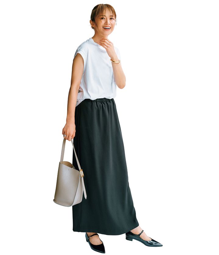 スカート¥29,920(アンクレイヴ ホワイト/アンクレイヴ〈オンワード樫山〉)Tシャツ¥42,900(ebure/LITTLE LEAGUE INC.)カーディガン¥34,100(ロンハーマン)バッグ¥35,200(ダブルスタンダードクロージング/フィルム)ブーツ¥99,000(ネブローニ)バングル¥26,400(フィリップ オーディベール/essence of ANAYI)
