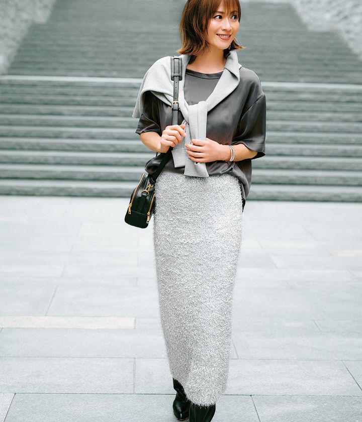 素材感と柄を重ねることでスタイルに箔がつく! 一癖あるデザインスカートも同じグレー合わせなら優しげで気取らない印象に。