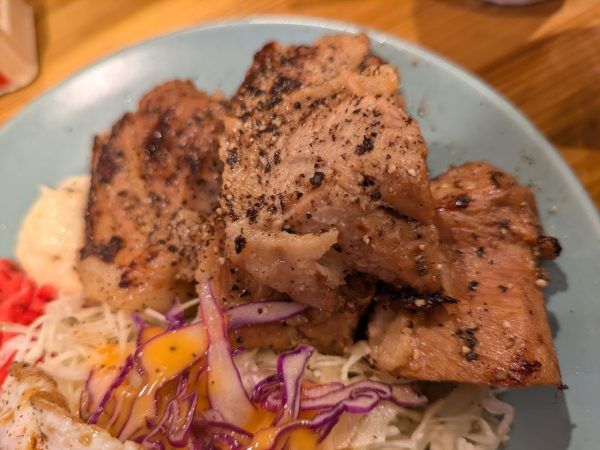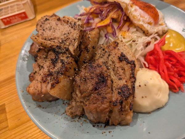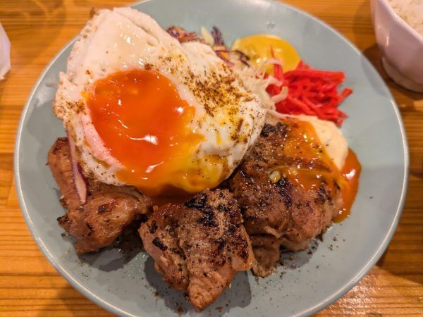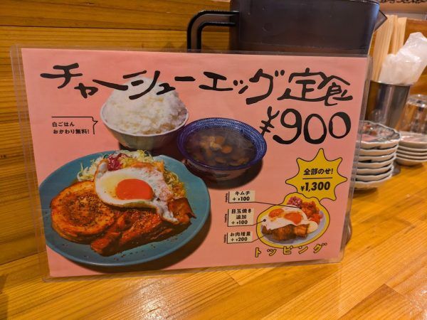 るなるなは、お一人様なのでカウンター席でゆっくりとランチをいただきます。いいですね~。チャーシューエッグ定食!この一皿の中にるなるなの大好物が全部あります!トッピングでキムチ、目玉焼き追加、お肉増量の全部のせで1300円もありますが、初めてなので、定番のチャーシューエッグ定食を食べたいと思います。