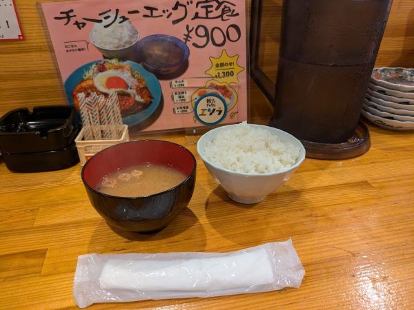 お味噌汁とご飯が出て来ました。ご飯のおかわりは無料だそうです。いいですね~。カウンター席なので、チャーシューの焼ける匂いがめっちゃします。