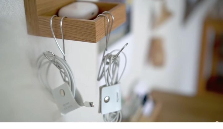 リビングでは、スマホの充電器やイヤホンをかけて収納する方法がおすすめです。テーブルや引き出しに収納するのに比べてからまりにくく、コンパクトにしておけな見た目もすっきり。