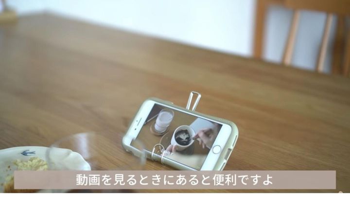 動画では無印良品の「ステンレスひっかけるワイヤークリップ」を使用しています。スマホの形状によっては立てられないことがあるかもしれません。まずは収納用のワイヤークリップで試してみてください。