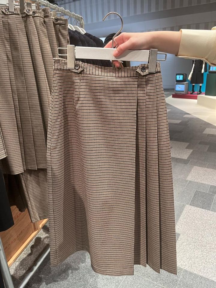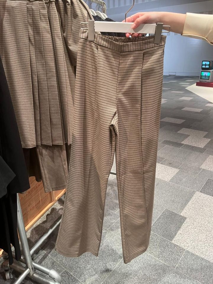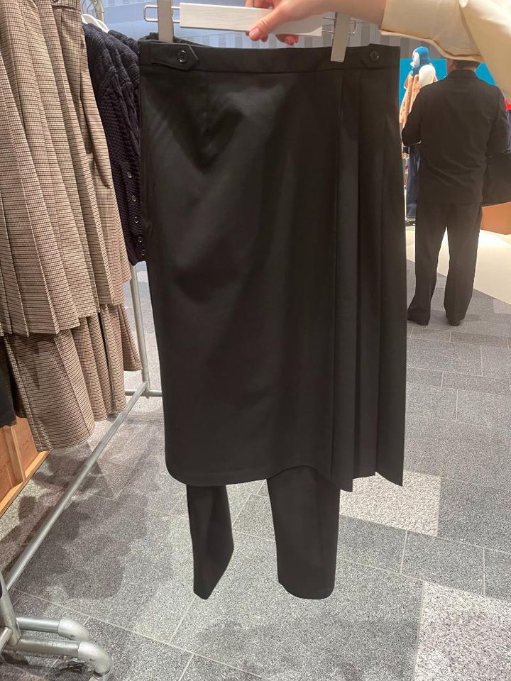 巻きスカートとフレアパンツのセットももちろんバラバラで楽しめます。スカートは膝丈、パンツはウエストゴム入りのセンタープレスだから大人も穿きやすいんです。ちょっぴりハードルが高いアイテムですが、GU価格、rokhのモード感でなら始めやすそう。