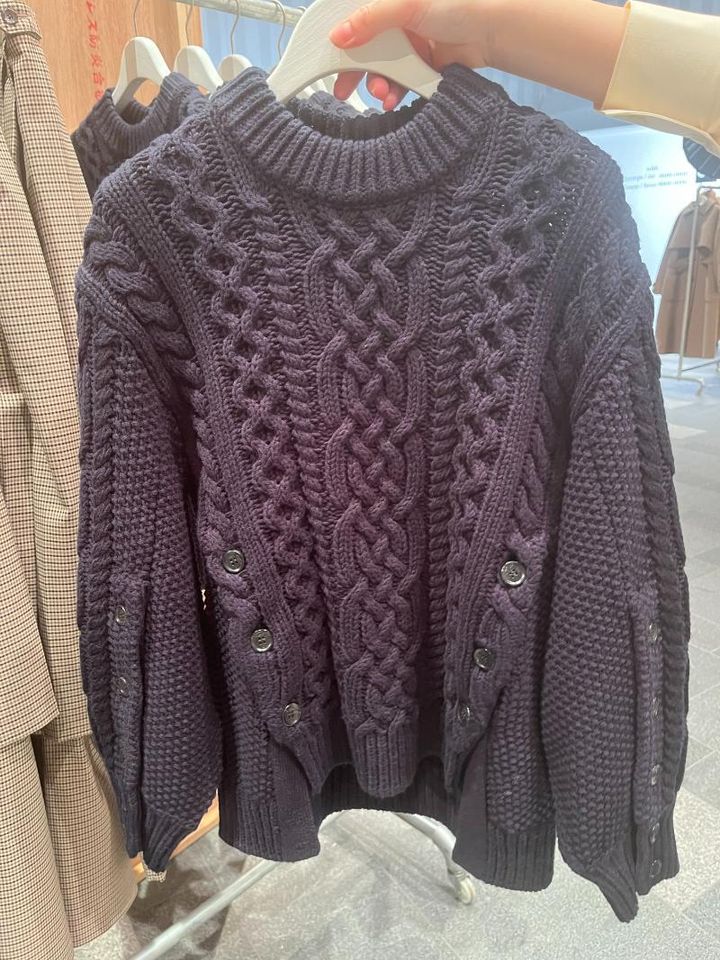裾のボタンを外せばシャツをレイヤードしやすくなり、袖のボタンを外せばケープのようなデザインに変化。今回のコラボは1枚で何度もおいしいデザインが多く、ざっくりとした編み目が特徴のニットもこれを象徴するアイテムのひとつ。濃紺があるのもママに推したい理由です。