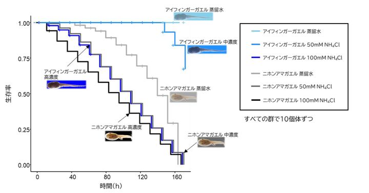 この実験では、アイフィンガーガエルとニホンアマガエルの幼生を様々な濃度の塩化アンモニウム水溶液の中で飼育し、生存率を比較。