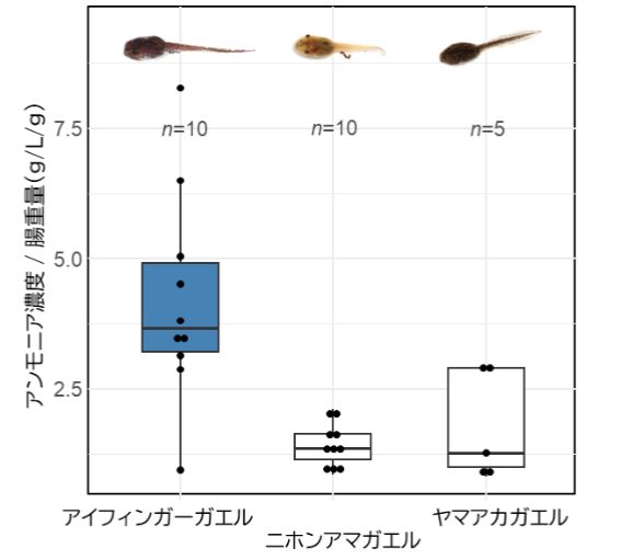 すると今度はアイフィンガーガエルだけが他の3種に比べて、ウンチ中のアンモニア濃度が高レベルで蓄積されていたのです。