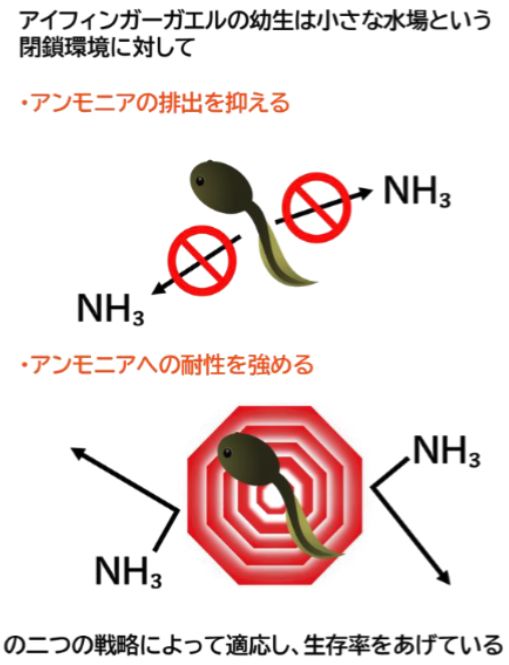その結果、アイフィンガーガエルはニホンアマガエルが生存できないアンモニア濃度でもほとんど死亡することがなかったのです。
