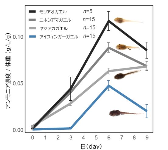その結果、他の3種に比べて、アイフィンガーガエルは環境中に排出しているアンモニア量が大幅に少ないことがわかったのです。