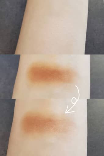 ▲上:単色でのせた色み、下:単色アイシャドウに上から重ねるとまろやかな色みに