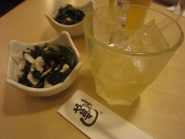 出雲市産シャインマスカット酒のロックとビールで乾杯です。お通しの酢の物と一緒に届きました。午後7時までは、ドリンク半額(一部除く)のタイムサービスもあって、とってもお得ですよ。